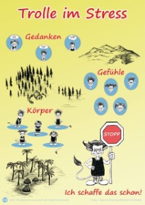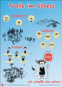 Das Troll-Poster stellt auf kindgerechte Weise die Ebenen Körper, Gedanken und Gefühle im Stress dar. Mit Hilfe des Posters kann jede Situation aus dem Alltag der Kinder mikroanalytisch im Sinne des SORCK Schemas betrachtet und Handlungsstrategien entwickelt werden.